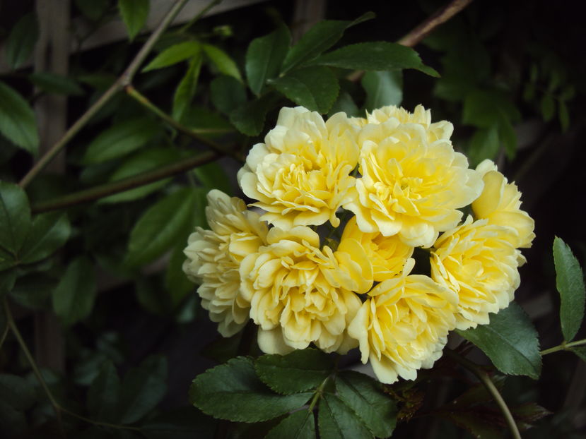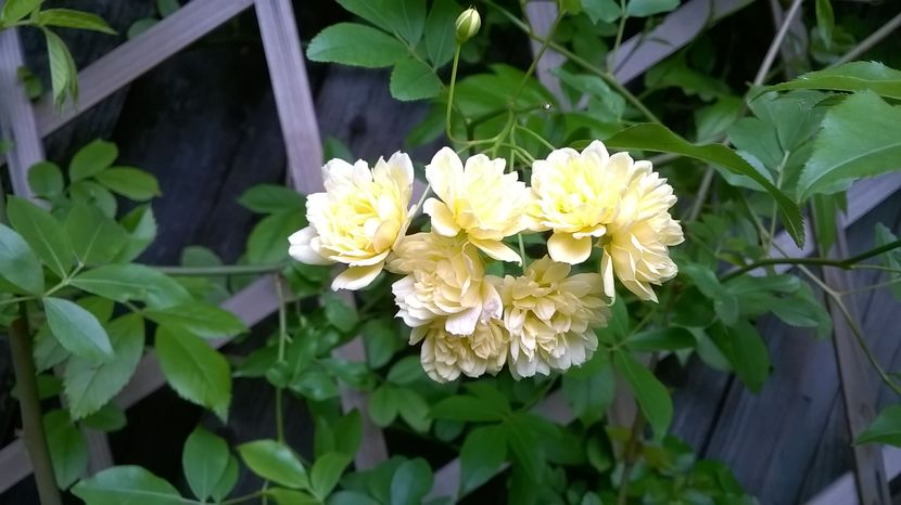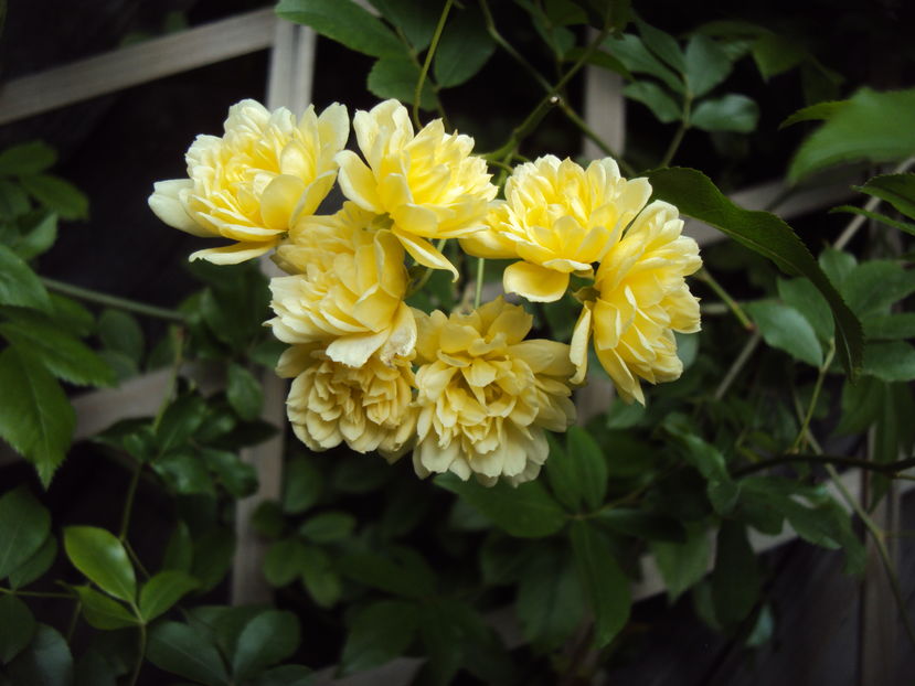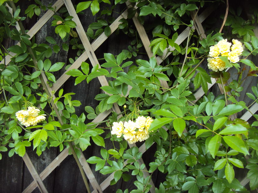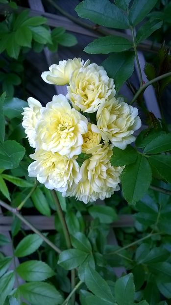 Light yellow Species. Exhibition name: R. banksiae lutea Introduced in United Kingdom by Royal Horticulture Society in 1824 as 'R. banksiae lutea'. Species / Wild. Light yellow. Mild, violets fragrance. Small, double (17-25 petals), in large clusters bloom form. Once-blooming spring or summer. Thornless (or almost). Height of 15' to 20' (455 to 610 cm). Width of 8' (245 cm). USDA zone 6b through 10b. Drought resistant. Prune after flowering is finished. This rose blooms on old wood. If you know the parentage of this rose, or other details, please contact us. See also Glossary: Banksian Roses.