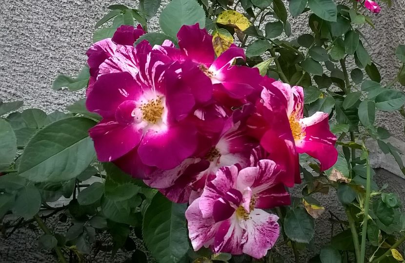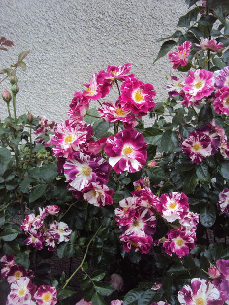 Purple, white stripes. None to mild, spice fragrance. 5 to 10 petals. Average diameter 3.5". Medium, semi-double (9-16 petals), in large clusters bloom form. Blooms in flushes throughout the season.